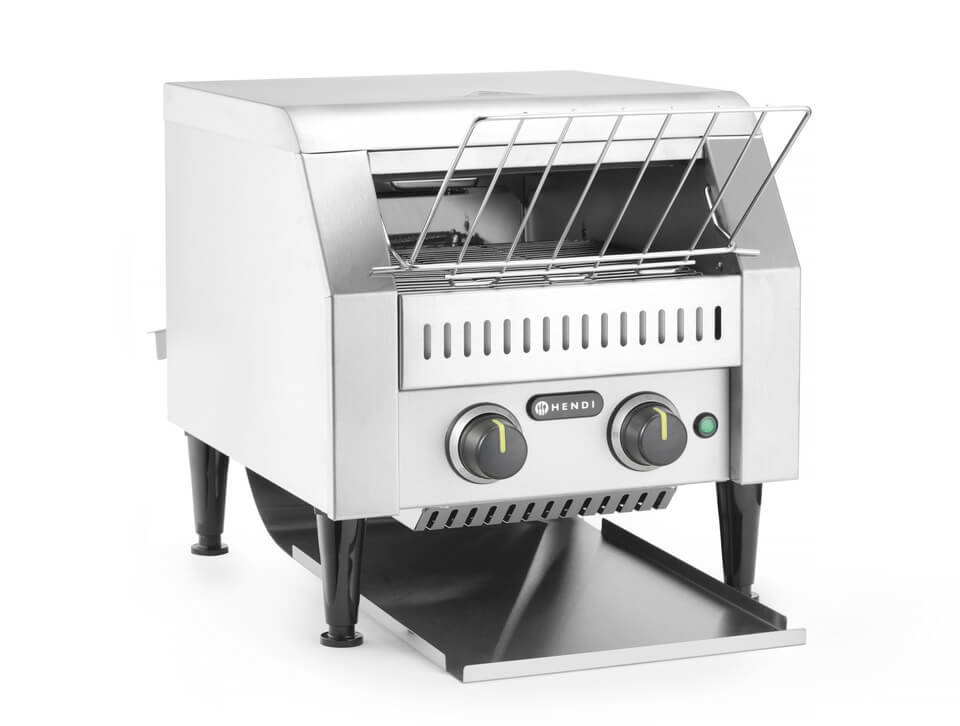 Fornito con vassoi anteriori e posteriori. Completamente in acciaio inox. Velocità del nastro trasportatore regolabile. Tempo di tostatura compreso fino a 3 minuti. Dimensioni 418x368x(h)387 mm. Potenza 2240 W. Colore argento/acciaio.